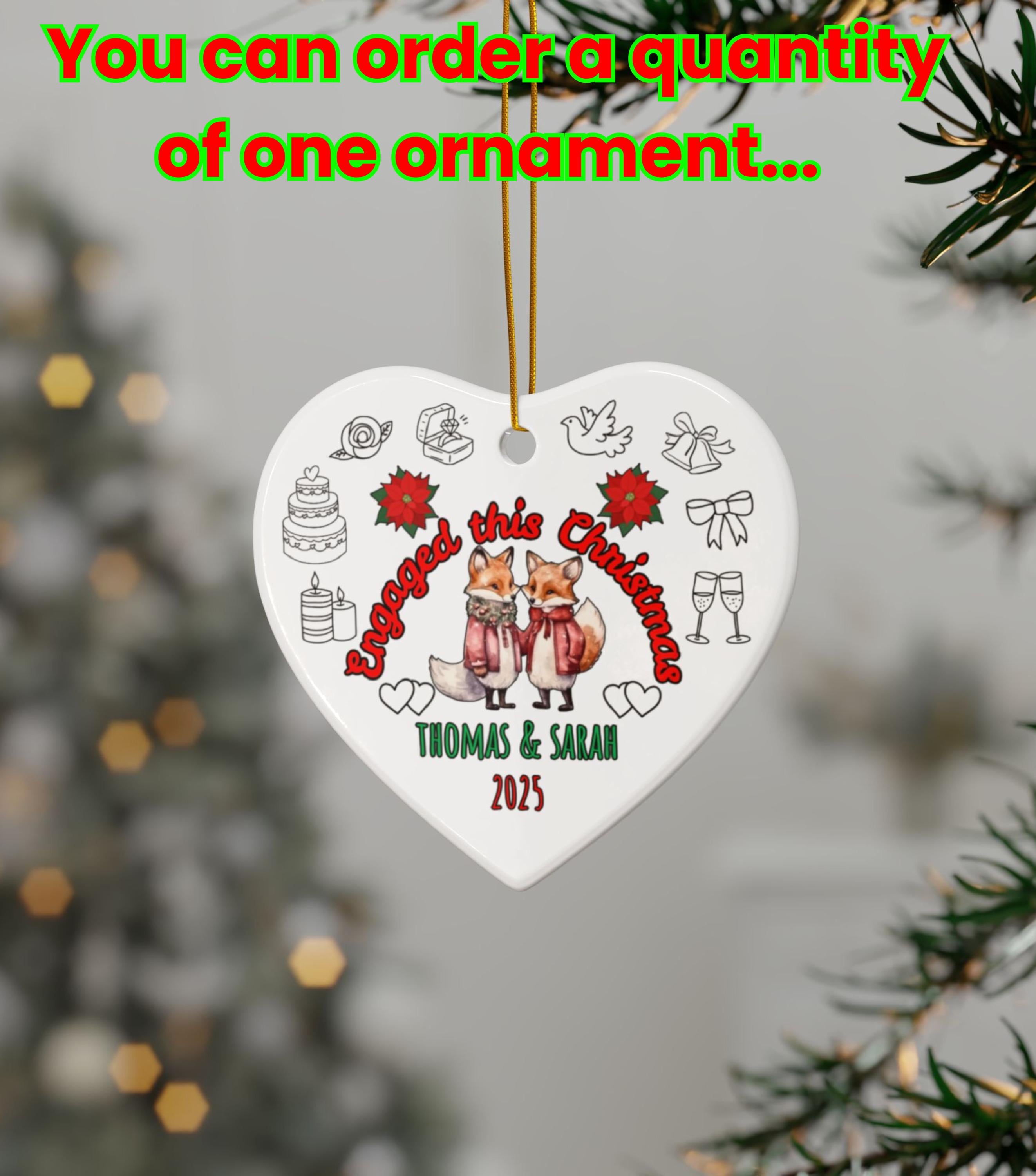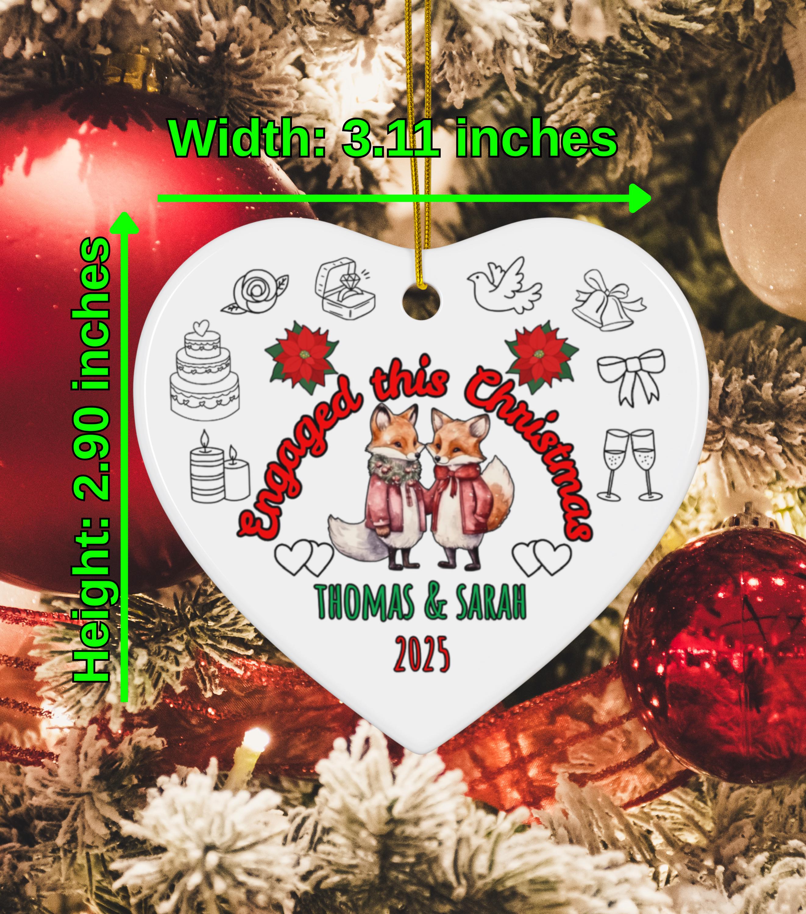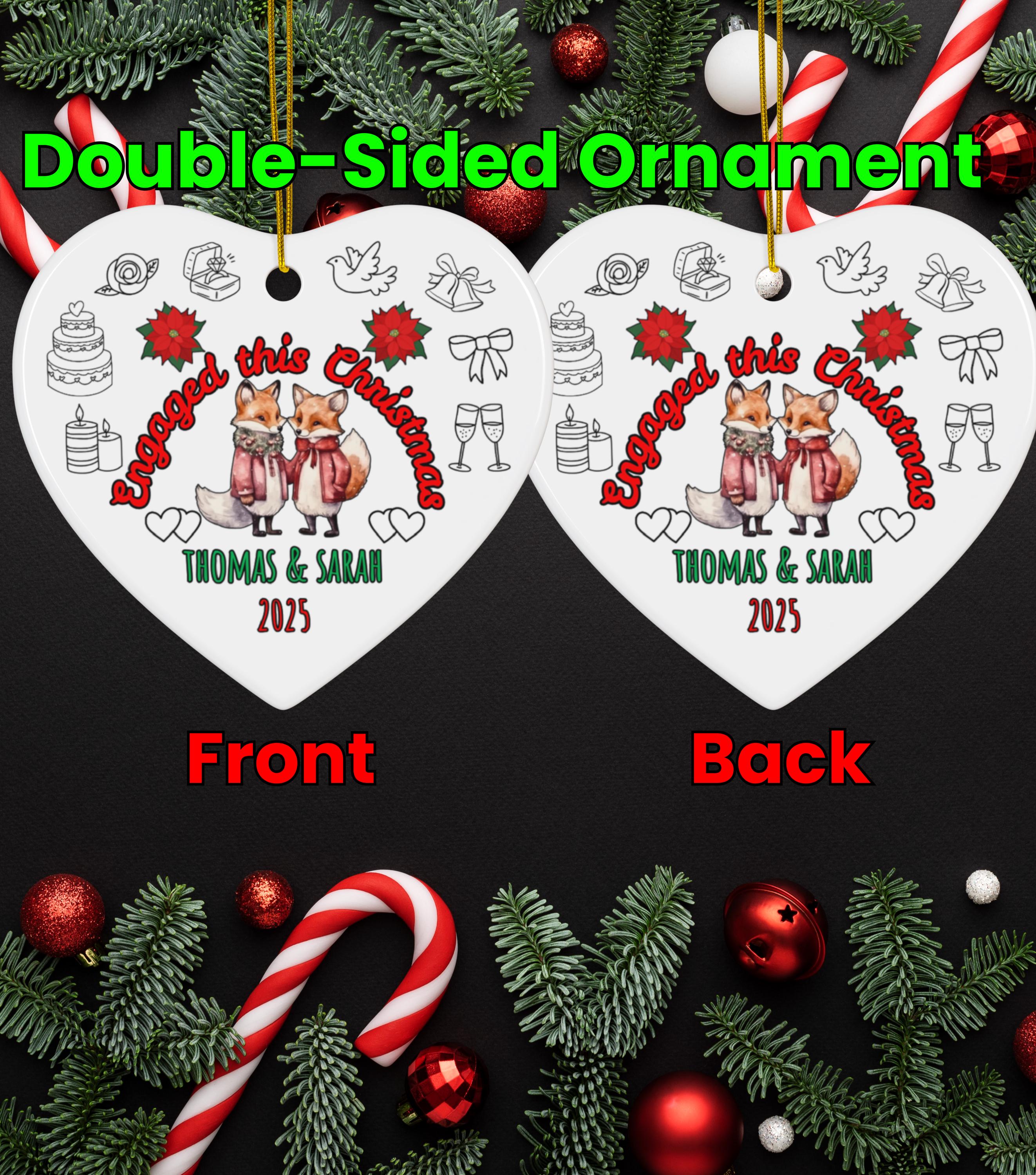 Double-Sided Fox Couple Engagement Ornament, Heart-Shaped Personalized Fox Christmas Ornament, Engagement & Marriage Gift