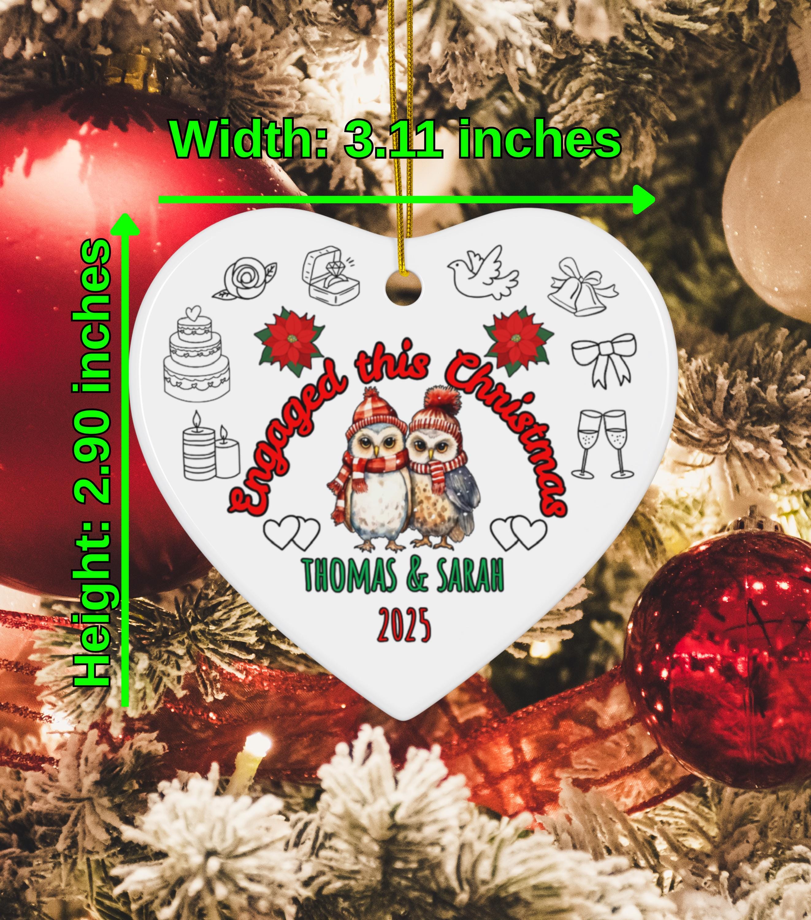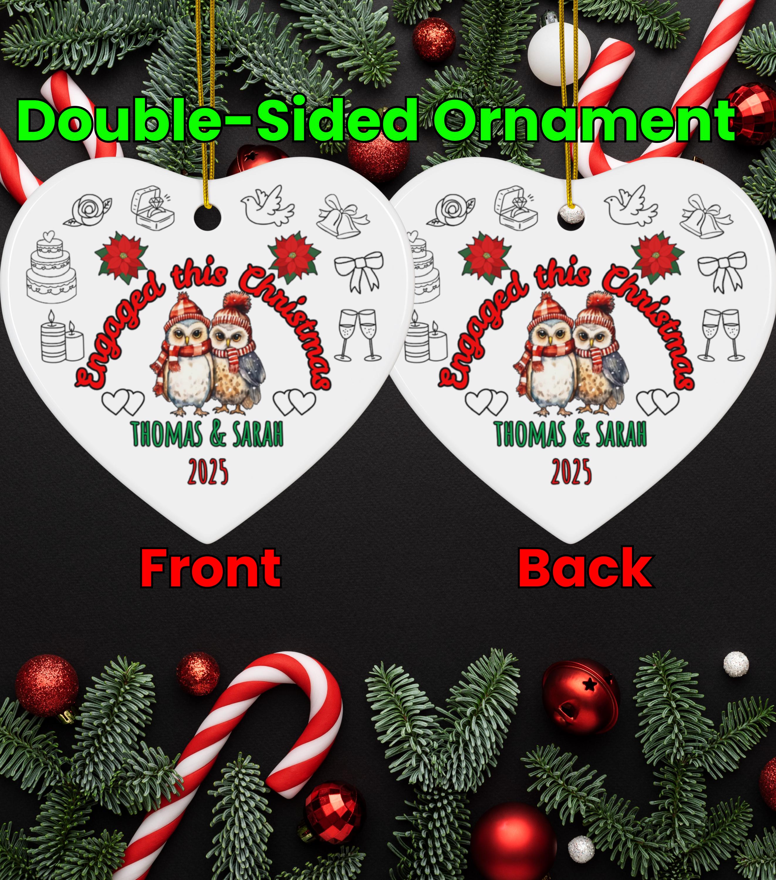 Double-Sided Personalized Owl Couple Engagement Ornament, Heart-Shaped Ceramic Owl Christmas Ornament, Owl Engagement Gift