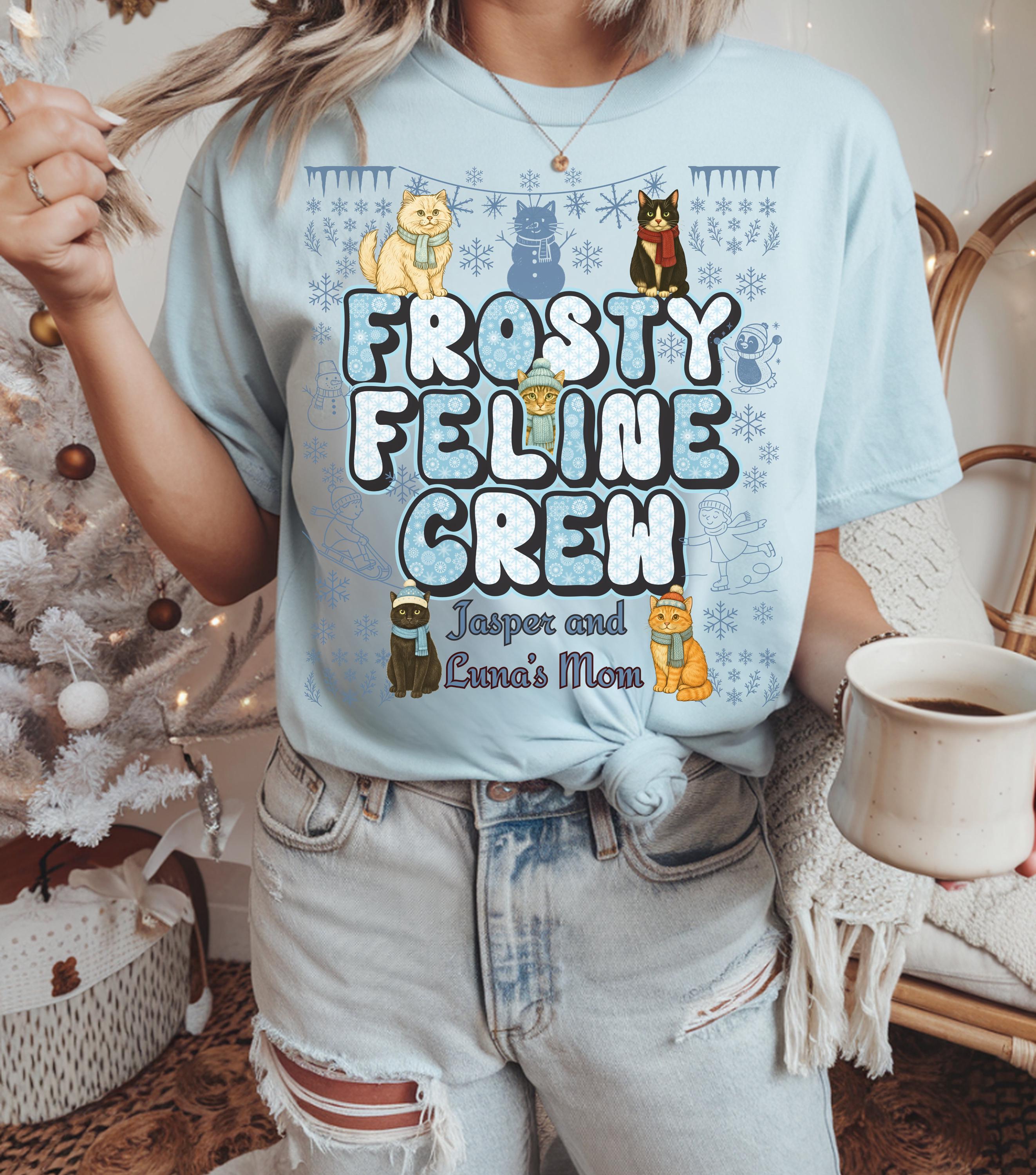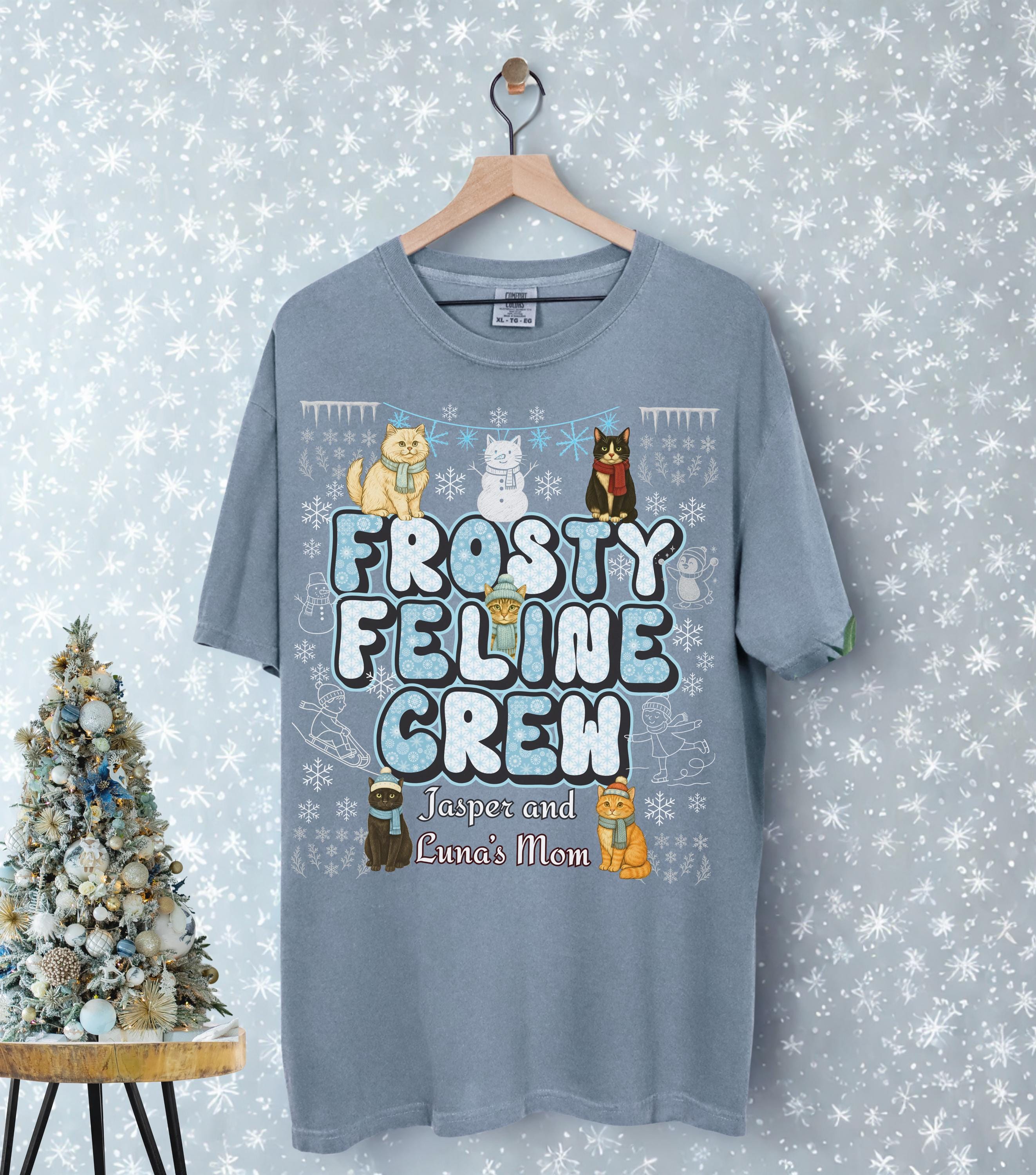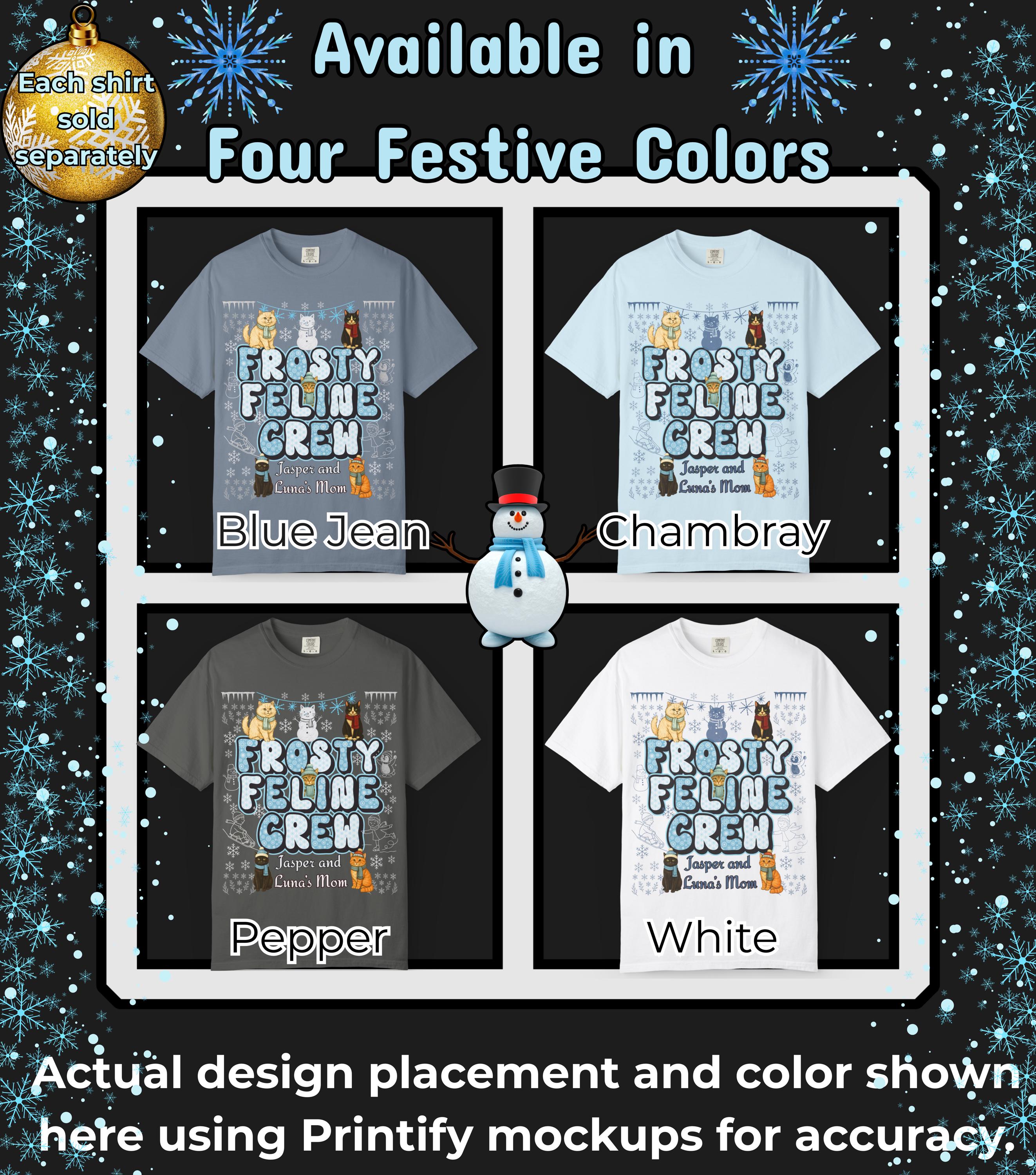 Frosty Feline Crew Shirt, Personalized Cat Lover Holiday T-Shirt, Holiday Shirt for Veterinarians, Cat Owners, Cat Care, Comfort Colors