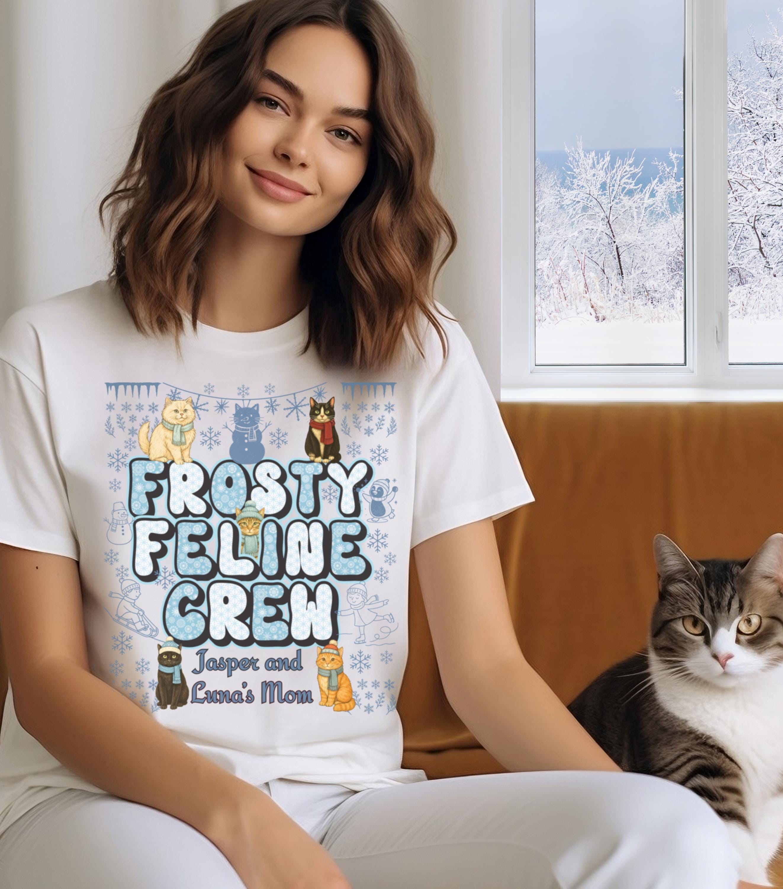 Celebrate the season with the Frosty Feline Crew — a playful shirt featuring bundled-up cats, snowy doodles, and cheerful frosty lettering. Personalize it with your name (or your cats’ names!) for a one-of-a-kind holiday favorite.